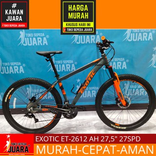 Exotic termasuk salah satu vendor yang juga menciptakan beragam produk sepeda mulai dari sepeda lipat sepeda gunung maupun sepeda biasa. Sepeda exotic 2655 27 5 inci ini tampil dinamis dan memiliki lekuk yang tetap nyaman dilihat serta sangat berkarakter. Sepeda ini dapat menjadi pilihan yang tepat karena harga sepeda yang tidak begitu mahal namun memiliki kualitas yang sangat tinggi. Jual sepeda gunung terbaru 2020 gratis ongkir se indonesia dan service selamanya.