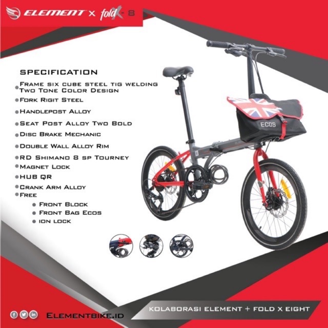 Untuk menunjang kemudahan pengendara element foldx 8 ini difasilitasi dengan 8 pilihan kecepatan dari shimano untuk menghadapi berbagai kondisi jalan dan memberi fleksibilitas dalam berkendara. Element foldx 8 limited grey 8 speed stock terbatasrp4 900 000. Perbandingan spesifikasi komponen fitur harga sepeda review bentuk dan gambar sepeda lipat folding bike element foldx 8. Sepeda lipat khusus dirancang agar dapat disimpan dengan praktis dan ringkas jual sepeda lipat terbaru 2020 gratis ongkir se indonesia dan service selamanya.