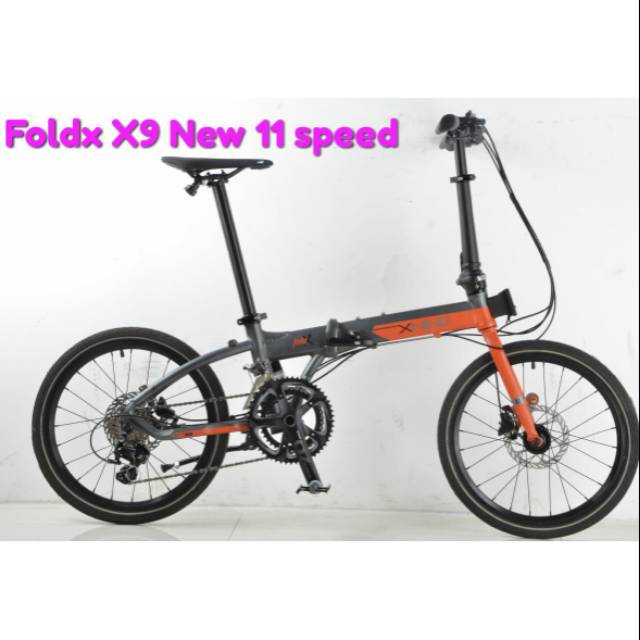 Sepeda lipat foldx xnine dengan pengaturan kecepatan 2 x 11 speed dan terbuat dari rangka alloy yang kokoh.